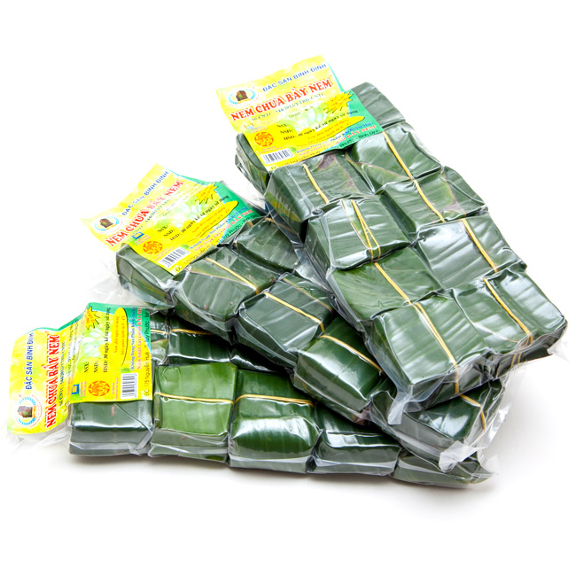 - Nem chua Chợ Huyện đựng trong bịch hút chân không. Mỗi bịch 10 chiếc.
