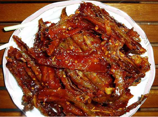 Cá lao tẩm gia vị (ớt sa tế, đường, muối...) rất thơm ngon, giòn. Là đặc sản riêng của Qui Nhơn.